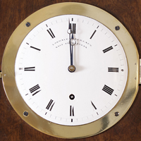 Gehäuse: Mahagoni auf Weichholz furniert mit gerade verlaufendem Unterteil. Emailziffernblatt, breite vergoldete Lünette, Ziffernblatt mittels vier Haken befestigt. Räderwerk mit Brücken und Kloben, Scherengang, geteiltes Stahlpendel mit Schneideaufhängung, Springsekunde, ovales Gewicht, Kontragesperr. Signatur auf dem Ziffernblatt und auf der Brücke über dem Bodenrad graviert, Gangdauer 30 Tage.