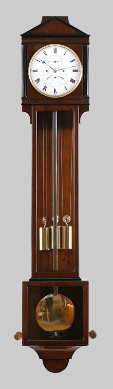 Laterndluhr, signiert: „Philipp Fertbauer in Wien“ - Wien um 1805 Länge: 160 cm Mahagoni auf Eiche furniert, keilförmiges Gehäuse mit feuervergoldeten Beschlägen und Messingstableisten, Datum und Springsekunde, glasverkapseltes Werk mit im Pendelstab integriertem Anker (Pendelstab fehlt), Oberteil abschraubbar, Gangdauer 1 Woche. Philipp Fertbauer (1763-07.06.1820), Großuhrmacher, 22.06.1795 Meister, 1804 Obervorsteher, 1805 Schätzmeister, erw. Stadt, Gruberisches Haus Strauchgasse no 252. Literatur: Österreichische National-Encyklopädie oder alphabetische Darlegung der wissenswürdigsten Eigenthümlichkeiten des österreichischen Kaisertumes, Friedrich Beck`schen Universitätsbuchhandlung, Wien 1836, S. 461. |