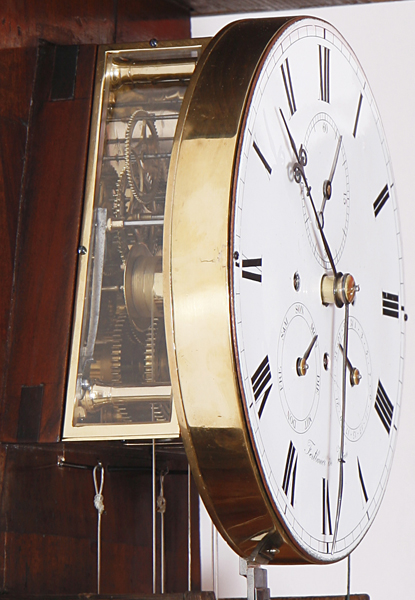 WIENER LATERNDLUHR, signiert „Fertbauer in Wien“ - Wien um 1810 Höhe: 140 cm Mahagonie furniertes Gehäuse, Emailziffernblatt, Hilfszifferblätter für die Tages- und Datumsanzeige, Wiener 4/4 Stundenschlag auf Glocken, glasverkapseltes, trapezförmiges Werk, Anker im Pendel integriert, dreigewichtig, Stahlpendel mit Messinglinse. Wochengangdauer. |