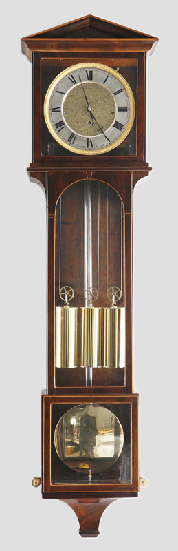 WIENER LATERNDLUHR, signiert: „F. Lahr in Wien“ - Wien, um 1820 Länge: 103 cm Mahagonigehäuse, Metallziffernblatt mit graviertem Mittelteil, versilberter Ziffernblattreifen, breite, vergoldete Lünette, dreigewichtig, Wiener 4/4 Stundenschlag, Stahlpendel mit Messinglinse, Gangdauer: acht Tage. Franz Lahr: Großuhrmacher, Neulerchenfeld in der Hauptstrasse 34., 1800 bis 1829. |