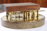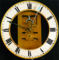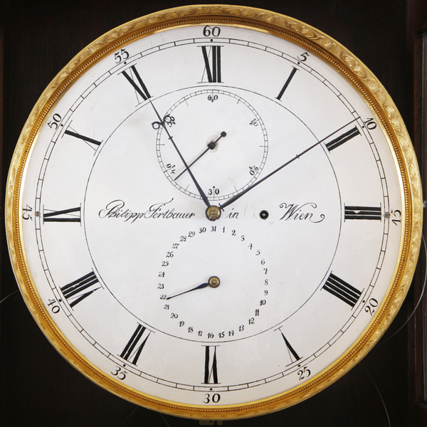 Mahagoni auf Eiche furniert, keilförmiges Gehäuse mit feuervergoldeten Beschlägen und Messingstableisten, Datum und Springsekunde, glasverkapseltes Werk mit im Pendelstab integriertem Anker (Pendelstab fehlt), Oberteil abschraubbar, Gangdauer 1 Woche. Philipp Fertbauer (1763-07.06.1820), Großuhrmacher, 22.06.1795 Meister, 1804 Obervorsteher, 1805 Schätzmeister, erw. Stadt, Gruberisches Haus Strauchgasse no 252. |