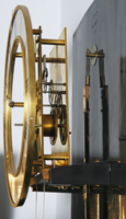 Ebonisiertes birnbaumfurniertes Gehäuse in T-Form, versilberter Metallziffernring, Skelettiertes Werk mit großem Bodenrad und Anker, Pendel mit drei Glasstäben, Gangdauer 1 Tag.